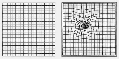 כך נראה ניוון מרכז הראייה: מימין, הקווים מתעוותים וכתם מופיע במרכז התמונה