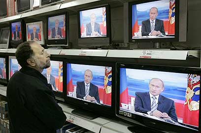 תושב מוסקבה צופה בפוטין משיב לשאלות אזרחים (צילום: AFP)