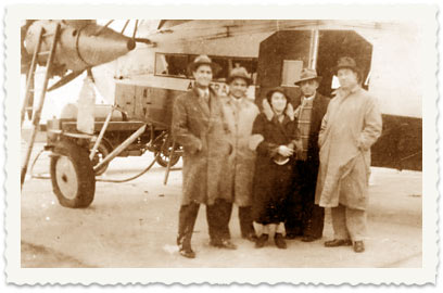 3. תיאודור מחליט לנטוש את החקלאות ולנסות כוחו בתיירות. תיאודור (שני מימין) ושרה טהון ליד מטוס אייר פרנס, בדרך לבגדד, בה פתח סניף של חברת התיירות "פלתורס". דמשק, חורף 1934