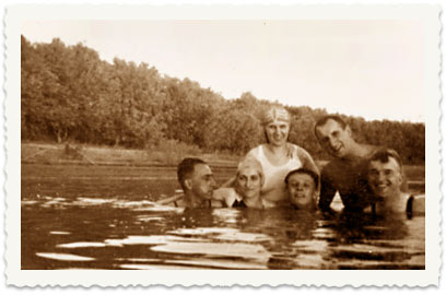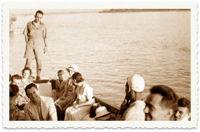 13. שיט בחידקל - מימין פרל שולר, נורה שולר בתה ואורי טהון. משמאל בחזית מוזס גלזר, אנה-רוזה שולר, אהרון ורשבסקי ושרה טהון. תיאודור טהון עומד. בגדד 1935