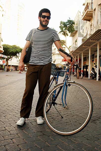 מושיק (25) - חולצה: מברלין; מכנסיים: של סבא; נעליים ומשקפיים: מירושלים; תיק: "אמריקן אפרל".