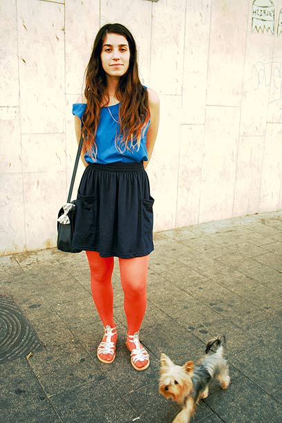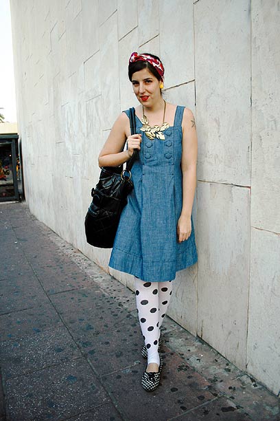 קארין (27) - שמלה ונעליים: "H&M"; תיק: קיבלה במתנה; גרביונים: משוק בצלאל; סרט שיער: יד שנייה; עגילים: ויצ"ו; שרשרת" מחנות בדיזנגוף סנטר.