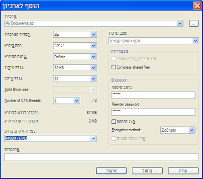 כל האפשרויות. חלון הדחיסה של התוכנה