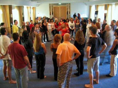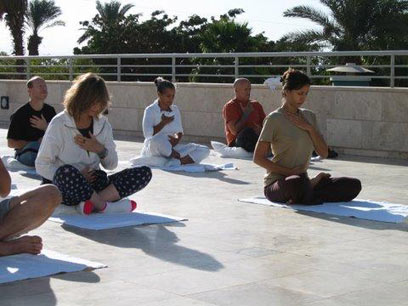 הכותבת (מימין) במדיטציית בוקר קבוצתית