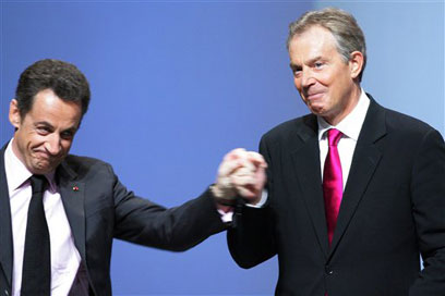 בלייר עם סרקוזי, אתמול בפריז. שיבח את מארחו (צילום: AP)