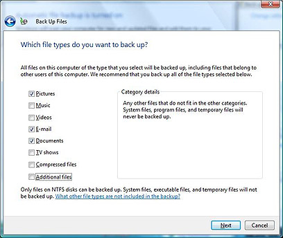 בשלב הבא (לאחר לחיצה נוספת על Next), תוכלו לבחור באילו סוגי קבצים תרצו לגבות. ניתן לבחור מבין תמונות, מוסיקה, וידאו, דואר אלקטרוני, מסמכים, תוכניות טלוויזיה, קבצים דחוסים וקבצים נוספים – להגדרתכם. תוכלו לבחור חלק או את כולם. אנו ממליצים לבחור לפחות את התמונות, המסמכים ואת הדואר האלקטרוני, כפי שרואים בתמונה. כמובן שכדאי לבדוק אילו קבצים נוספים תרצו לגבות.