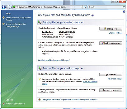 בעזרת "מרכז הגיבוי והשחזור" ניתן גם לגבות את כל המחשב למצב קודם, או להתקנה מלאה חדשה (אפשרות זו לא מגיעה עם גירסאות Vista Home Basic ו-Vista Home Premium). הגיבוי נעשה בעזרת לחיצה על הכפתור "גבה את המחשב" (Back up computer), כשלאחריו תדרשו לאשר פעולה. לאחר מכן Vista מחפשת מה לגבות, ואז באשף שיפתח תצטרכו לבחור להיכן לגבות (אחד הכוננים של הדיסק הקשיח או ה-DVD). שימו לב! אם תבחרו לגבות למדיה אופטית, דעו שהתהליך גוזל מספר משמעותי של תקליטורי DVD ריקים.