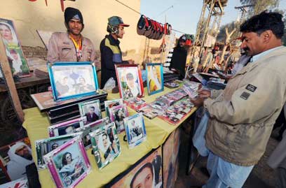 דוכן מזכרות מבנזיר בוטו סמוך לקברה, היום (צילום: AFP)