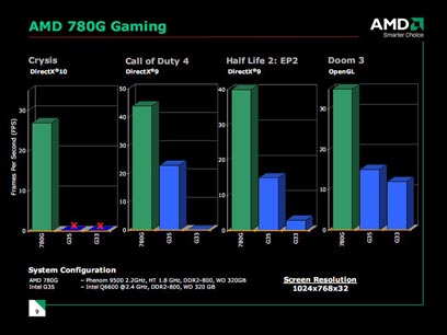 השוואת הביצועים במשחקים לפלטפורמה המשולבת האינטלית. AMD 780 בעמודות הירוקות. מקור: AMD