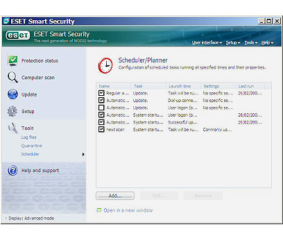 ברוב הכלים של ESS ניתן לשלוט באופן דומה - התכונות הבסיסיות זמינות דרך הממשק היפה, והתכונות המתקדמות יותר (כמו ביצוע בדיקת וירוסים יזומה או תזמון של בדיקה כזו) דרך הממשק הישן והמכוער הנגיש בתוספת של עוד כמה קליקים. בתחתית כל מסך בממשק המשתמש תמצאו קישור ל-Advanced Mode; קליק נוסף ישלח אתכם להגדרות הרלוונטיות בתוך ה-Advanced setup tree.