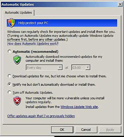 אם אתם לא מספיק מסודרים ואחראים כדי לעדכן את מערכת ההפעלה על בסיס קבוע, אפשר ב-XP וב-Vista להגדיר את התהליך כך שיהיה אוטומטי לחלוטין, ללא מגע יד אדם, וכל עוד המחשב דלוק העדכונים יזרמו לבד משרתי מיקרוסופט.