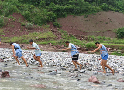 עכשיו כשהמים רדודים והזרם מתגבר, הם קופצים מדי פעם למים כדי להתקרר, פותחים את החבלים וגוררים את הסירה קדימה. המדריכה מספרת על מסורת בני המקום (שבט ה-Hu Dai) ומנהגיהם, על הכפר בו הבנות היפות ביותר (כי שם המים נקיים והירקות והפירות משובחים), ועל המנהג לשתול עצים עם לידת בת בכורה. במלאת לה 10 שנים כורתים את העצים ועושים מהם שולחנות וכסאות – נדוניה לנישואיה בגיל 15. שרשרת טיפים ובחזרה לאוניה.