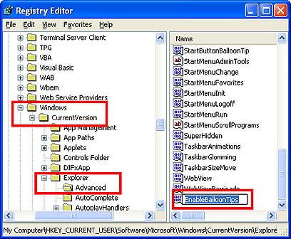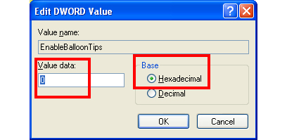 מקליקים קליק כפול על EnableBalloonTips, מוודאים שמסומנת האפשרות hexadecimal והערך הוא 0.