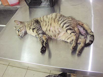 ד"ר עופר עינב, הווטרינר העירוני, הגיע למרפאה לטפל בחתולה. "למרות שהמחלקה סגורה ביום שישי, הבנתי שמדובר במקרה יוצא דופן. הערכתי שלאחר שחלף זמן כה רב, כל הגורים שהיו אצלה בבטן מתו. מצבה היה קשה אך עדיין ניתן היה לבחור בין האפשרות להרדים אותה למוות ובין אפשרות להצילה", סיפר עינב ל-ynet. "זו הייתה ככל הנראה ההמלטה הראשונה שלה, והיא מבוהלת מאוד, חסרת אונים ולא ידעה כיצד להוציא את הגור החוצה".