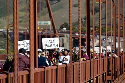 מפגינים למען בורמה על גשר הזהב בסן פרנסיסקו (צילום: AFP)