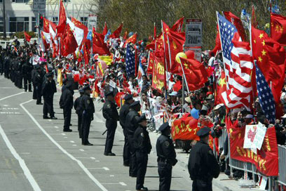 "הרבה טיבטים נהרגים", אמר קונגה ישי, בן 18, שנסע כל הדרך מסלט לייק סיטי כדי להפגין בקליפורניה נגד סין. "הסינים אמרו שישתנו אם יזכו לארח את האולימפיאדה, אך הם עדיין לא השתנו". בצדו השני של הכביש, הוריד אוטובוס עשרות פעילים למען סין. "הרוח האולימפית מאחדת את כל בני האדם, לא רק הסינים - גם את אמריקה והעולם כולו", אמר הוי צ'ן, בן 36, מסן חוזה.