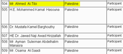 ברשימת המשתתפים נכללים 537 אישים, כשבמשלחת ישראל 23 נציגים בראשות לבני. את פלסטין מייצגים שישה - וטיבי בראשם. לכל אחד מהמשתתפים מצוין "מקום העבודה", ואצלו נכתב בעמודה זו: "כנסת ישראל, ערבי".
