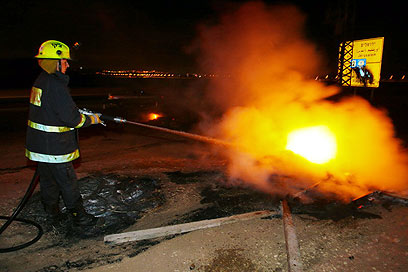 כבאים מכבים את הצמיגים הבוערים (צילום: חגי אהרון)