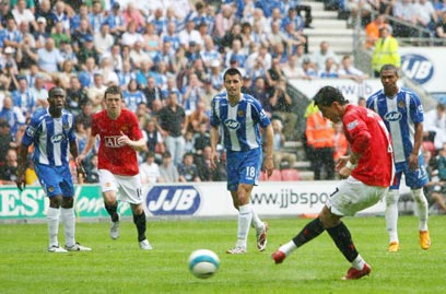 פרגוסון היה יכול להתחיל לחייך בדקה ה-32 אחרי שוויין רוני נתקל ברגל של מגן וויגאן ברחבה והשופט החליט שזה מספיק בשביל להצביע על הנקודה הלבנה. כריסטיאנו רונאלדו ניגש לבעוט וכבש בקלילות שער שעשוי להכריע את המאבק, 0:1 למנצ'סטר. המקומיים לא נשברו והגיעו כעבור חמש דקות לשתי הזדמנויות מצויינות ברחבה, אך הכדורים שרקו ליד הקורות של יונייטד, 0:1 למנצ'סטר במחצית.