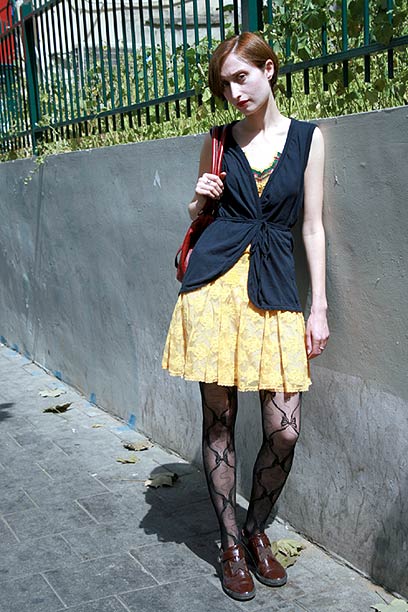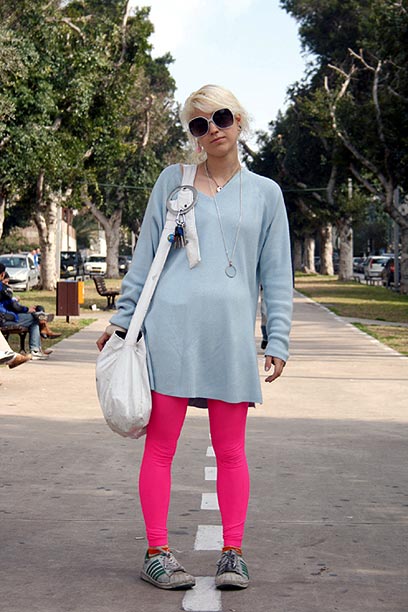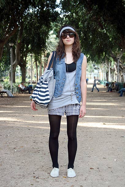 ז'קט, "נייקי"; משקפיים, מארצות הברית; תיק, "טופשופ"; עגילים, מלונדון.