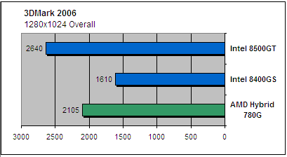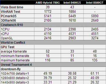 במבחן PCMark05 המחשב האינטלי הציג עדיפות ברורה של 6 ו-14 אחוזים (בהתאמה) עם ה-8400GS וה-8500GT. במבחן 3DMark06 הוא היה איטי ב-24 אחוז עם הראשון ומהיר ב-25 אחוז עם השני. במילים אחרות: לפי המבחן הזה הפתרון האינטלי היקר יותר הוא המשתלם ביותר.