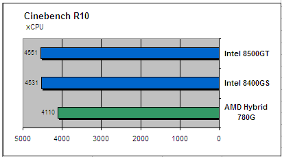 Cinebench R10. גם במבחן הזה, המתמקד בביצועי גרפיקה ותלת-ממד, בולטים היתרונות של השילוב אינטל-Nvidia. למבחן שלושה חלקים: 1CPU, הבודק את ביצועי ה-Rendering של ליבת מעבד בודדת; xCPU שמנצל את ריבוי הליבות; ובדיקת יכולות ה-OpenGL שרלוונטיות לחלק מיישומי ומשחקי ה-3D. בשני הראשונים השיג המחשב האינטלי ביצועים גבוהים ב-10 עד 12 אחוז. במבחן השלישי שבו יש חשיבות גדולה יותר לתת-המערכת הגרפית, הפער גדל ל-20 עד 35 אחוז.