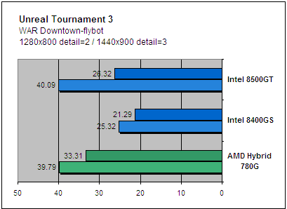 בכל שלושת המצבים מחשב ה-AMD Game! הביס את תצורת ה-GeForce 8400GS (יתרון של 27 עד 56 אחוז בביצועים). מול ה-GeForce 8500GT התקבלו תוצאות מעורבות: במצב א' המחשב האינטלי השיג תוצאה עדיפה בהרבה. במצב ב', קיבלנו תיקו. במצב ג', המחשב האינטלי הגיע ל-26.3 fps (פריימים לשניה) בלבד. המחשב של AMD הגיע ל-33.3 fps, כמעט 27 אחוזים יותר.