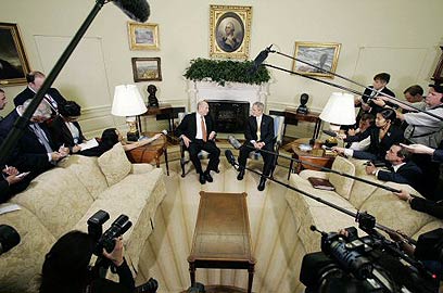בוש קיבל את פני אולמרט בחדר הסגלגל לעיני התקשורת (צילום: רויטרס)