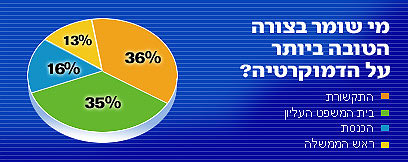 הסקר השנתי של המכון הישראלי לדמוקרטיה: לראשונה זה שנים מאבד בית המשפט העליון את מקומו כגוף המשמעותי ביותר בשמירה על הדמוקרטיה - התקשורת תפסה את מקומו. 71 אחוזים מהישראלים נותנים אמון בצה"ל, רק 17 אחוזים מאמינים בראש הממשלה. ומה חושבים גולשי ynet?
