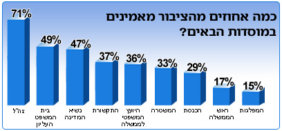צה"ל הוא המוסד שזוכה למידת האמון הגדולה ביותר עם 71 אחוזים. למרות זאת, האמון בצבא ירד בשלושה אחוזים בהשוואה לשנה שעברה. בחירתו של שמעון פרס לתפקיד נשיא המדינה סייע למוסד הנשיאות, לשקם את מעמדו. כיום 47 אחוזים מהציבור מאמינים בנשיא, לעומת 22 אחוזים בשנה שעברה.