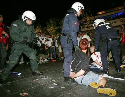 אוהד שנעצר על ידי המשטרה. לילה קשה באוסטריה (צילום: AFP)