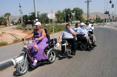בכסאות גלגלים וקלנועיות, מקריית שמונה לירושלים. זו שיירה אחת מבין כמה שיירות שיצאו לדרך הבוקר (יום ה') בדרך לבירה - שם הם אמורים להצטרף ל-20 מחבריהם המפגינים כבר כשלושה שבועות מול משרד האוצר, במחאה על הקפאת הקצבאות ובעיית העסקתם של העובדים הסיעודיים.