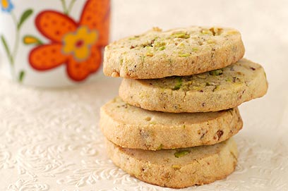 לכבוד השקת המקום, ביקשתי מתמר מתכון לעוגיות פיסטוק, שאותן, כמו מרבית סוגי העוגיות מבצק פריך, ניתן להקפיא ולאפות כשמתחשק, או כשהאורחים בפתח. פשוט מכינים בצק במעבד מזון, מגלגלים לגלילה, מאחסנים במקפיא, שולפים בשעת הצורך, פורסים ואופים. העוגיות הללו קלות להכנה, טעימות מאוד, לא מתוקות מדי ונהדרות לצד כוס קפה.