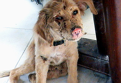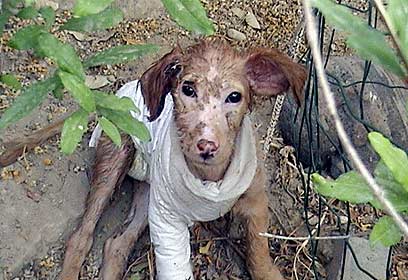 כשהגיעו השתיים למרפאה הן הזדעזעו ממצבו של הגור. "אלמונים התעללו בו באכזריות בלתי נתפסת. הפרווה שלו חרוכה כמעט בכל הגוף, והוא סובל מפצעים פתוחים. בפנים שלו יש כוויות - ככל הנראה מחומצה. מי שהתעלל בו גם כיבה לו על המצח סיגריות והותיר שם סימני כוויות עגולים", סיפרה קרלן. "כשניסינו להרים אותו, הוא צורח מכאבים ובתחילה היה מאוד קשה להביא אותו אלינו הביתה".