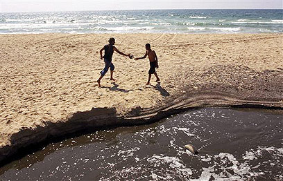 ילדים משחקים ליד הביוב בחוף עזה (צילום: AP)