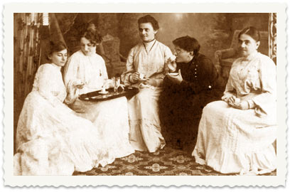 13. חמש גרציות שותות קפה, 1905. מימין: אולגה חנקין, מניה (וילבושביץ) שוחט, (אחותו של נחום וילבוש) סוניה (אלכסנדרה) בלקינד, דובה בלקינד, שושנה (פיינברג) וילבושביץ' . פאני לא סלחה ששכחו לצרפה לתמונה.