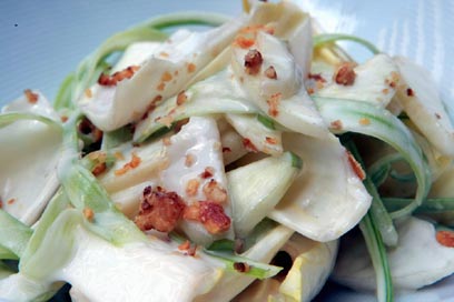 לפני שבועות אחדים הופתעתי למצוא אותו מבצבץ בתפריט הווייטנאמי-צרפתי של "הוטל מונטיפיורי" התל אביבי. כאן כמובן לא הלכו על הנוסח המוכר ויצרו סלט משודרג, כולל שימוש בעלי אנדיב ובגילופי סלרי (הסלרי מפגין לאחרונה נוכחות גוברת במנות ארצנו.(