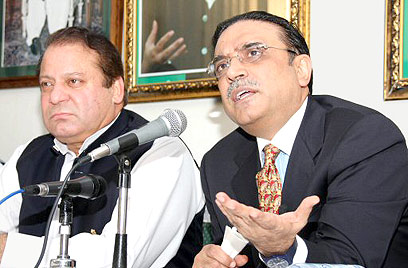 אסיף עלי זרדרי (מימין) ונוואז שריף, במסיבת העיתונאים (צילום: AFP)