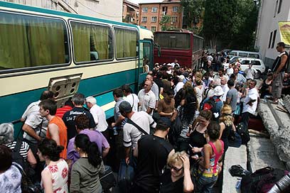 המונים מנסים לעלות על האוטובוס בדרך לטיסה (צילום: צור שיזף, טביליסי)