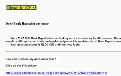 גולשים רבים קיבלו במהלך השבת והבוקר פניה בדואר אלקטרוני, המורה להם להיכנס ולעדכן את סיסמאת ההתחברות שלהם לאתרי בנק הפועלים ובנק אוצר החייל. מדובר בתרמית מסוג פישינג (phising), בה מנסים נוכלים לדלות פרטי חשבון בנק, כרטיס אשראי וקודים סודיים של לקוחות הבנק באמצעות אתר מזוייף.