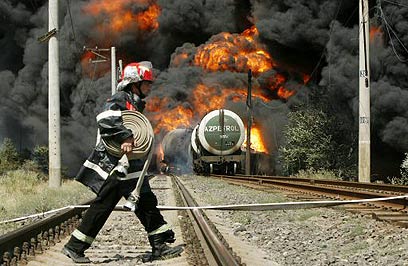 במקביל לדיווחים על עגינתה של הספינה האמריקנית, הודיע משרד הפנים הגאורגי שרכבת שנשאה דלק על הקו המחבר בין מזרח למערב המדינה נפגעה בפיצוץ מוקש באזור העיר גורי. דובר המשרד, שוטה אוטיאשווילי מסר כי עשרה מתוך 30 קרונות הרכבת שנשאו מכלי דלק עלו באש. עשרים הקרונות הנותרים הופרדו מהרכבת הבוערת כדי שלא ייגרם להם נזק.