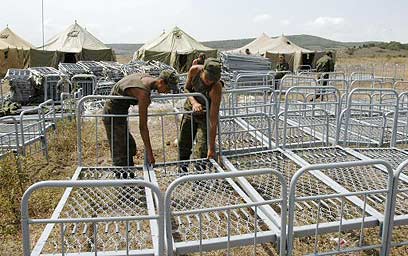 חיילים רוסים מתקינים מיטות בבסיס בדרום אוסטיה (צילום: רויטרס)