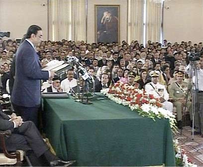 אסיף עלי זרדרי התקבל בקריאות "תחי בוטו" והושבע לנשיא. הוא מחליף את פרבז מושארף, שנטל את השלטון בהפיכה צבאית לפני 9 שנים. עלייתו לשלטון נסללה בעקבות ניצחון מפלגתו בבחירות, חודשיים אחרי רצח מנהיגת התנועה, רעייתו