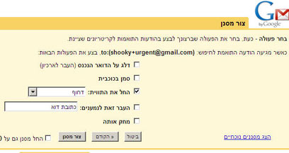 כדי ליצור פילטר חדש הקליקו על הקישור Create a Filter (צור מסנן) בחלק העליון של החלון, מימין לכפתורי החיפוש. הזינו את התנאים הרצויים - למשל: ממי ההודעה התקבלה, מילים שהיא כוללת וכו' - והקליקו על Next או 'הבא'. בחלון הבא תוכלו לבחור בפעולות שאתם רוצים לבצע על ההודעה.