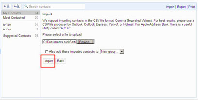 כעת, היכנסו ל-Gmail, הקליקו על הקישור Contacts (אנשי קשר) בטור השמאלי, מתחת לתיקיות. בחלון שמופיע הקליקו על Import או ייבוא (למעלה מימין על המסגרת הכחולה). הקליקו על Browse או עיין כדי לאתר את קובץ ה-CSV שלכם. לבסוף, הקליקו על Import (למטה משמאל, מוקף באדום בתמונה).