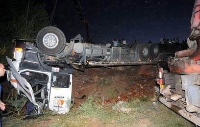 המשאית ההפוכה לאחר התאונה בגליל העליון (צילום: אביהו שפירא)