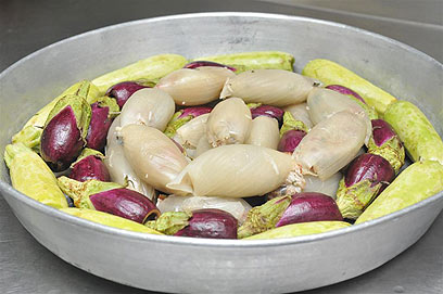קישואים, חצילים ובצלים ממולאים באורז ובשר