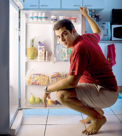 הפלישה למקרר: שש פגישות עם הדיאטנית מירב יעקובסון משירות "דיאטנית עד הבית" של "כללית אישית," ב880- שקל סך הכל. לפני הפגישה הראשונה ערך עמיר הכנות מדוקדקות. "זו לא סיטואציה טבעית," הוא אומר, "זו בפירוש חדירה אינטימית. לפני שהיא הגיעה ניסיתי לצמצם מראש את כמות המשקאות המוגזים והמיצים בבית, כי ידעתי שאף דיאטנית לא תאשר את זה, אבל אז הבנתי שכמה שאחשוף יותר את ההרגלים שלי כך היא תוכל לעזור לי יותר. החלטתי להתייחס לזה כמו לביקור אצל רופא, כשאתה מגיע עם בעיה ומספר גם פרטים אינטימיים מחייך. לשמחתי, היא ביקשה בנימוס שאראה לה את הארונות ואת המצרכים, ולא כמו בחיפוש משטרתי."