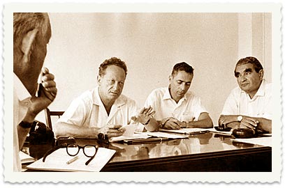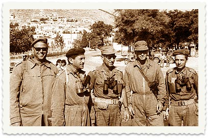 9. ששת הימים, מפקדת אוג' 36 לאחר קבלת כתב כניעה מראש העיר שכם. דני מימין, אורי רום מחט 37, במרכז אלוף פלד ולידו מוסה פלד, רמ"ט האוגדה. 8.6.67