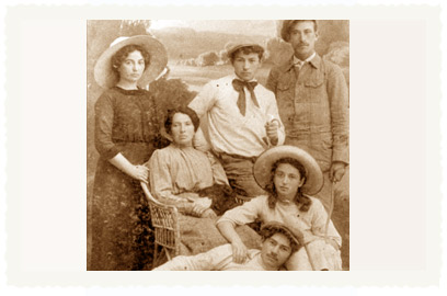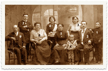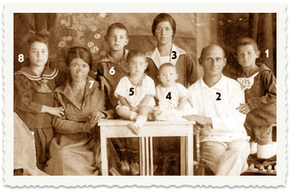 4. בבית משפחת יזרעאלי, כנרת, 1923: 1 - עמנואל, 2 - דוד, 3 - אסתר, אחותה של חנה, 4 - שמואל, 5 - שלומית, 6 - בנה של אסתר, 7 - אמא חנה, 8 - ימינה, הבת הבכורה.
